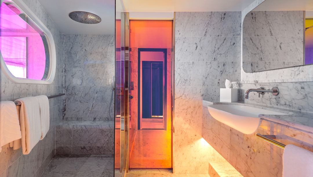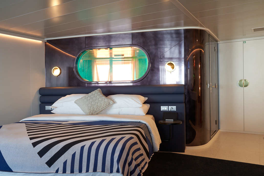 Bright, spacious, and perfectly dialed-in, the Brilliant Suite brings RockStar energy to sea days. A king bed and open living area flow to a private sea-view terrace, while a glam marble bath with rainfall shower and backlit vanity handles the getting-ready glow. Expect mood lighting, premium linens, and a curated bar setup. RockStar Quarters perks include priority boarding, Richard’s Rooftop access, and a dedicated RockStar Agent.