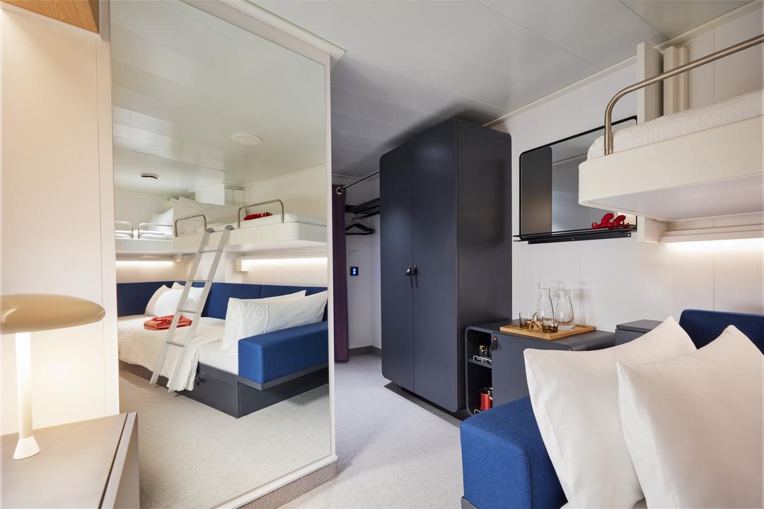 The Social Insider is built for friends traveling together: a smart, space-efficient cabin with an upper bunk, convertible sofa and generous seating so hanging out is easy. Includes an ensuite with rainfall shower, USB charging and smart storage — affordable, social, and steps from the ship’s dining and entertainment decks. Perfect for groups who want value without sacrificing style.