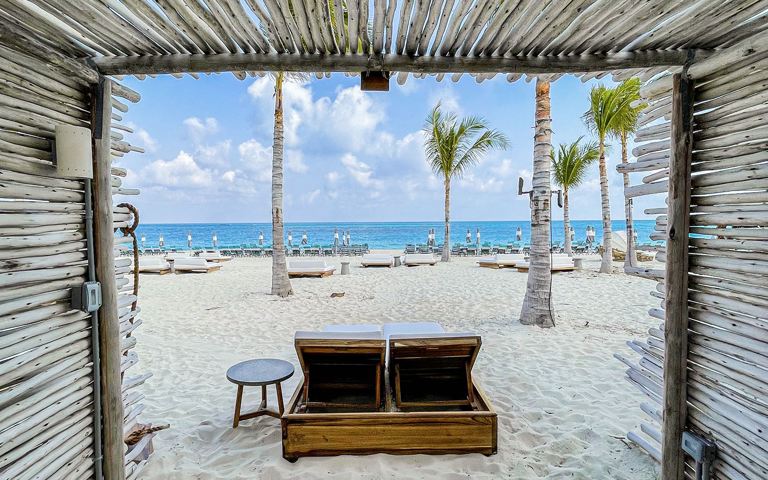 A shady, chic pavilion offering a break from the sun. It's the perfect spot to play games like shuffleboard. and giant Jenga or just relax on a comfy sofa with a cocktail.